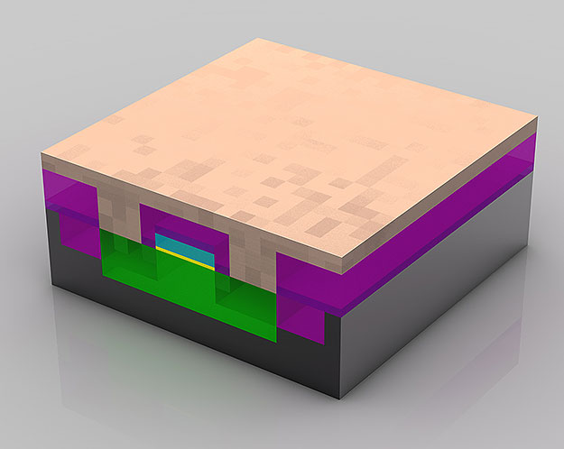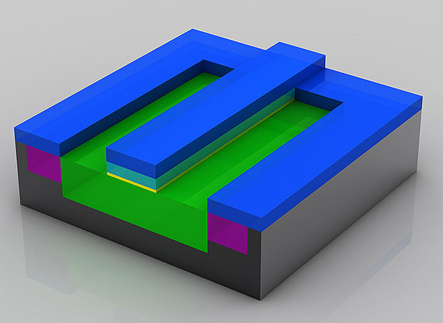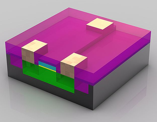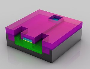 Este transistor está ya casi terminado. Se han dejado tres agujeros en la capa de aislamiento (De color magenta) situada por encima del transistor. Estos tres agujeros se llenarán con el cobre necesario para las conexiones con otros transistores.