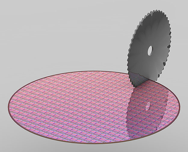 Para producir la base de los circuitos integrados, el lingote se corta en discos de silicio individuales llamados obleas.