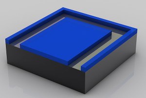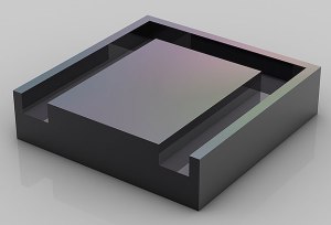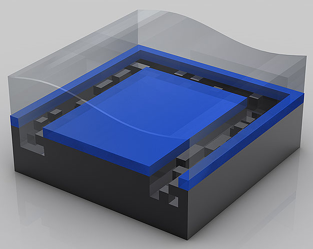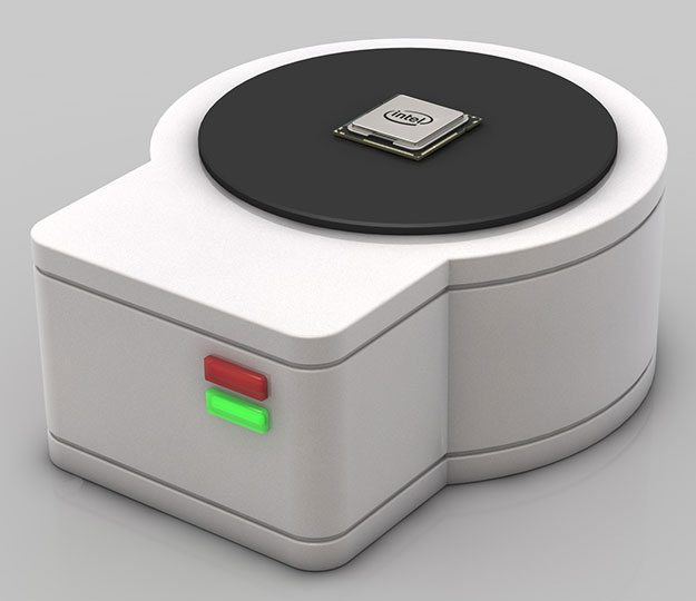 A continuación se unen la base con los conectores, el trozo de oblea y la tapa disipadora de calor, para formar un procesador completo (20 mm).