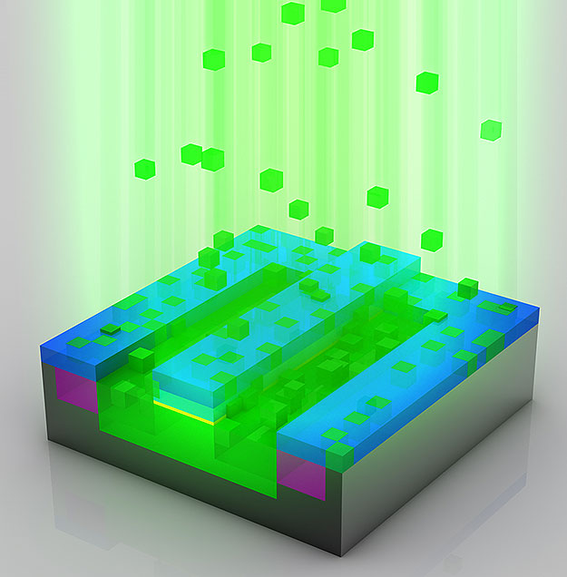 Después de la implantación de los iones, en el proceso de dopaje, se retira el material fotorresistente. Las zonas semiconductoras se muestran de color verde con unas inclusiones de otros materiales.