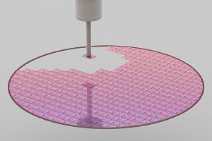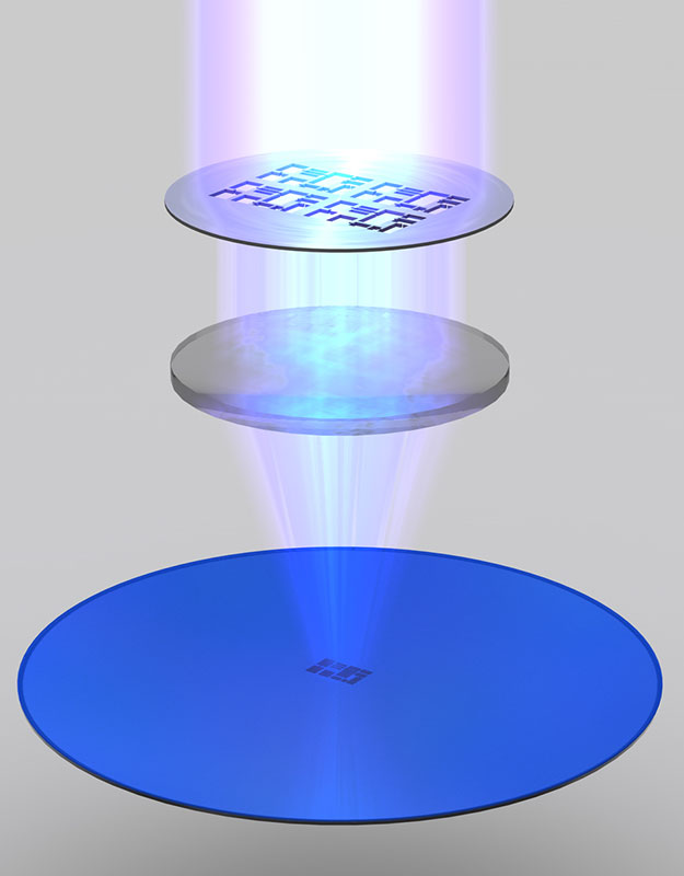 La exposición fotográfica de la película de la oblea se realiza con rayos ultravioletas. La reacción química que se desencadena en ese momento es similar a lo que sucede en el material de la película en una cámara de cine en el momento de presionar el botón de filmación. Las zonas de la superficie fotosensible de la oblea expuestas a la luz ultravioleta se convierten en solubles. La exposición se realiza a través de máscaras que actúan como plantillas, reservando algunas zonas de la oblea de la acción de los rayos ultravioletas. Se han de utilizar diferentes máscaras para cada capa del circuito integrado. Una lente (Visible en el centro) reduce la imagen de la máscara. De esta forma el espacio expuesto (Impreso) sobre la oblea es unas cuatro veces más pequeño que el de la máscara.