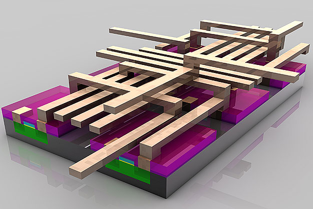 A continuación se crean múltiples capas de metal para la interconexión entre los diversos transistores. El diseño de este cableado depende de las funciones que haya de tener el circuito integrado o el microprocesador (Como en el caso del microprocesador Intel Core i7). Mientras que a simple vista el aspecto de la superficie del microprocesador de un ordenador tiene una aspecto muy plano, en realidad puede tener más de 20 capas para formar circuitos complejos. Si pudiéramos ver una vista ampliada de un chip, veríamos una intrincada red de líneas de circuitos y transistores más parecido a un sistema futurista de carreteras de varias capas. En la imagen siguiente se vería el espacio correspondiente a unos 6 transistores (500 nm).