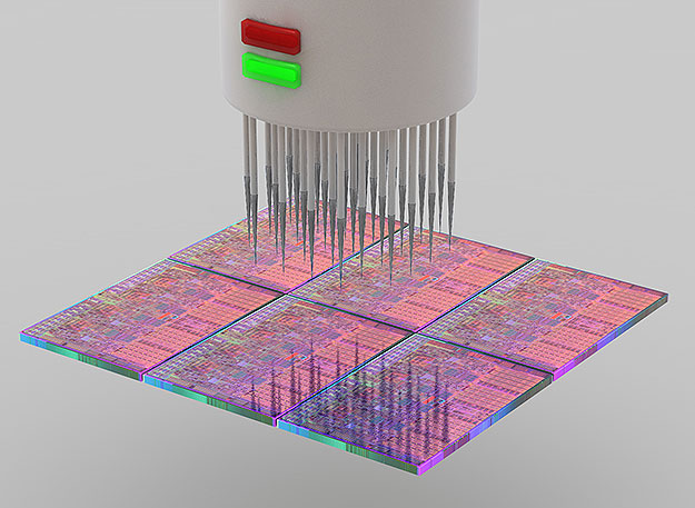 Cada una de las porciones de la oblea que se utilizará para la fabricación de un circuito integrado (En este caso microprocesador), de unos 10 mm de lado, se somete a una prueba de funcionamiento. En este proceso las puntas de prueba proporcionan la tensión necesaria y miden la respuesta del conjunto de transistores.