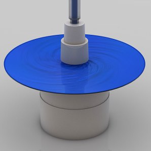 Sobre la superficie de la oblea se vierte un líquido (Representado de color azul), mientras que se le hace girar, para que se distribuya uniformemente, formando una capa muy delgada y resistente. Se trata de un material fotosensible similar al que recubre los papeles de la fotografía clásica.