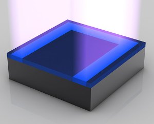 A continuación se coloca una capa fotoresistente en algunas zonas del futuro transistor (Aquí representada en color azul). Esta capa fotorresistente impide que en la zona cubierta por ella puedan penetrar los iones del siguiente paso del proceso.